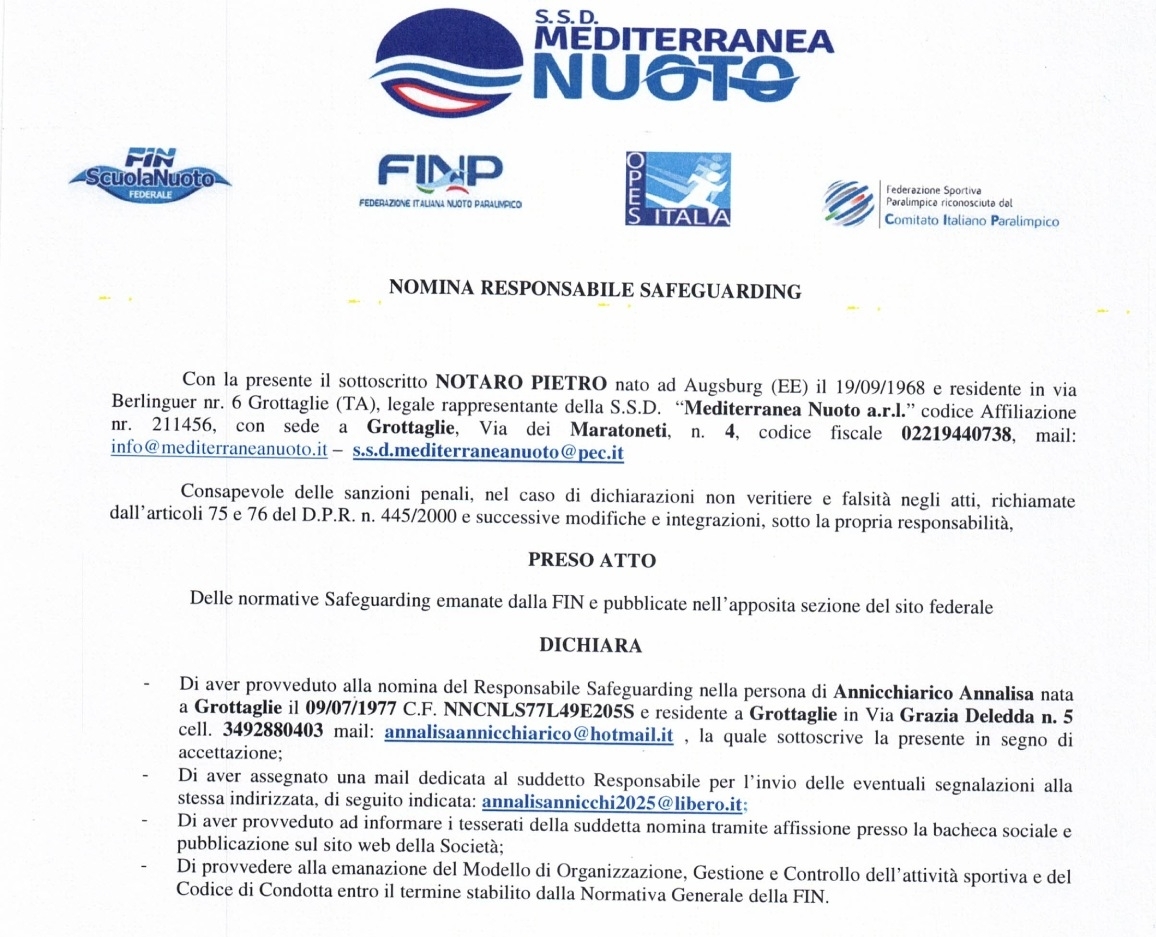 Piero Notaro è stato nominato Responsabile Safeguarding della Mediterranea Nuoto di seguito il link al pdf della nomina.